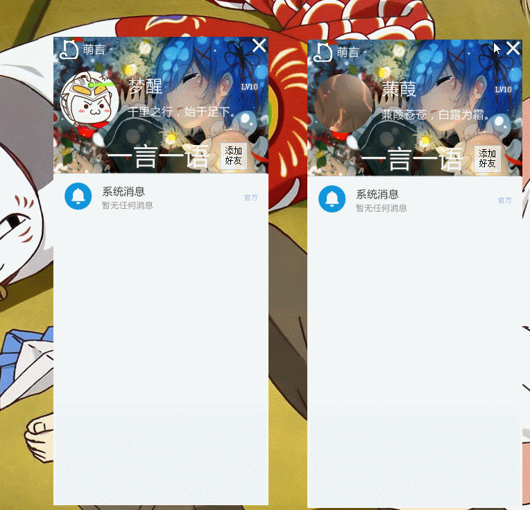 ❯[萌言]再来一次最近的进度_@时雨#日记2017/8/12约 1 分钟做了个官方账号[系统消息],演示图 这2天api也做了不少 PHP操作MySQL也熟练了许多 当前已拥有的功能:注册,登录,个人信息[昵称,头像,个性签名,地区·····],添加好友,系统提示