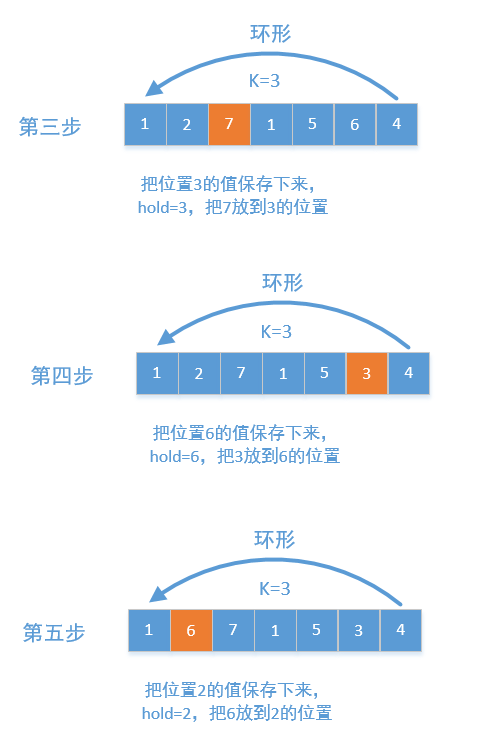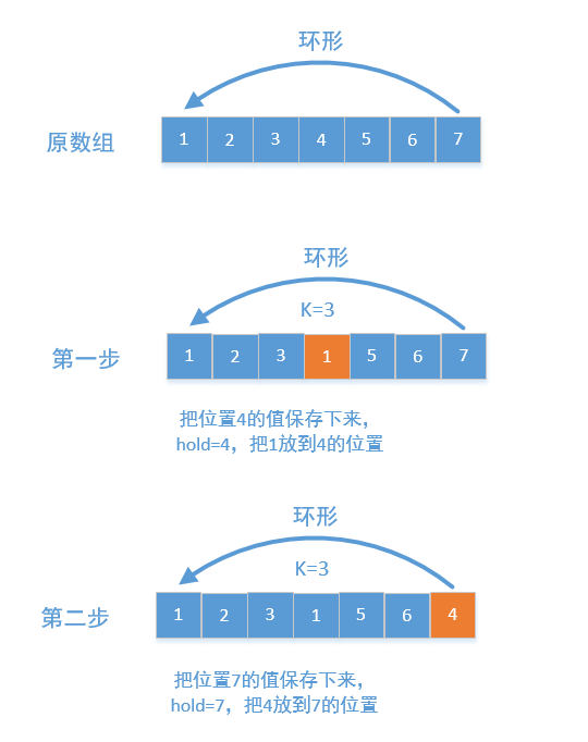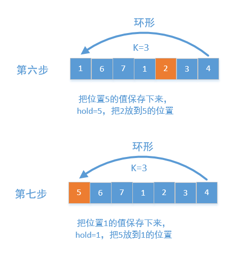 cnt += 1PS:第一种方法注意用nums[:]对临时的nums[n-k:] + nums[0:n-k]进行浅拷贝,第二种方法将整个数组看成一个环形,每个元素后移K个位置如图: