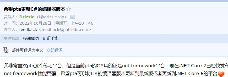 本着试一试的心态给pta发送了建议邮件,因为pta的C#判题编译器的版本比较低,想支持dotnet 6,在上午十点四十六的时候向官方发了这封邮件,本来以为应该会很长时间才会回复,或者直接不回复,没想到半个小时就收到了官方的回复~