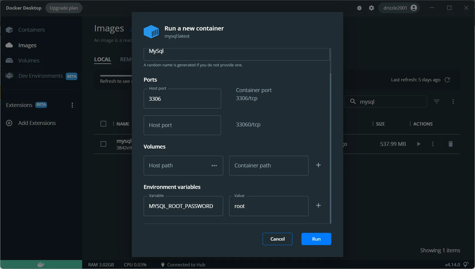 启动镜像生成容器,需要设置变量MYSQL_ROOT_PASSWORD,为默认root密码