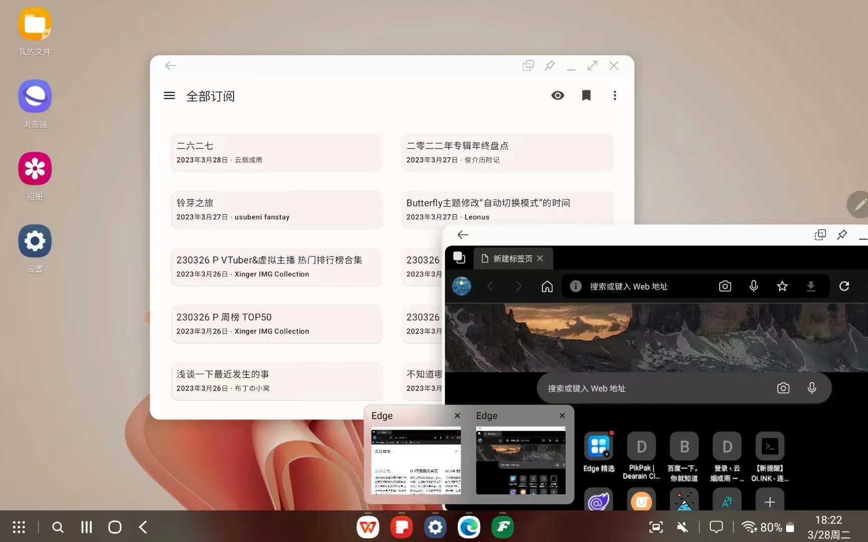 这是桌面模式下的界面,支持软件窗口化多开,例如edge可以开启多个窗口并且在任务栏提供预览,还有其他软件,感觉比ipad的台前调度强大很多