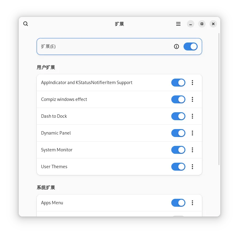 其中gnome-shell-extension-appindicator是一定要安装的,不然桌面没有托盘很多需要托盘图标的软件用起来会很难受。