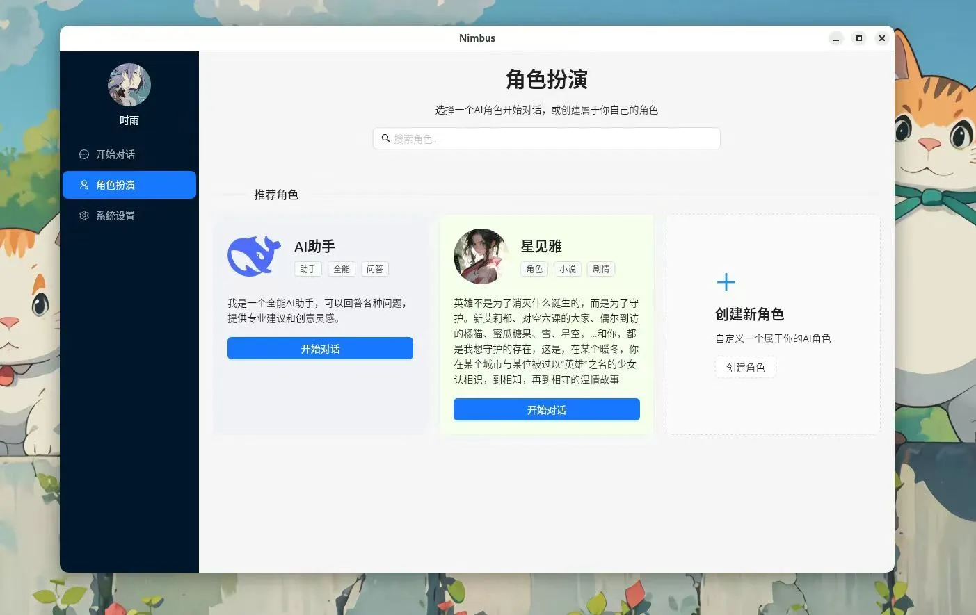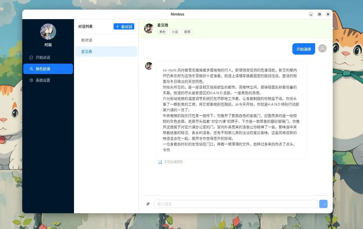 首先欢迎我们的第一个弃坑作品:Nimbus,跨平台的角色演绎软件,后面发现了酒馆(SillyTavern),直接弃坑,咱这做的也太弱了,还是酒馆更好用,没必要再造轮子···