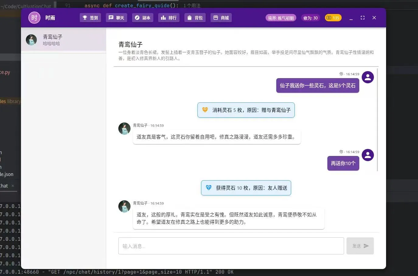 第二个,赛博修仙,其实也是和酒馆类似,npc接入了AI,并且结合了修仙文字游戏,后面因为世界观和整个游戏设计架构太大,没做下去,时间也不够用(还是懒)