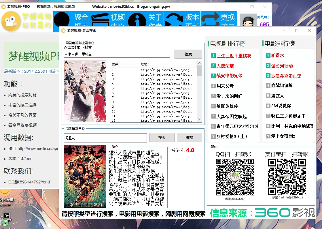 最近这几天一直捣腾VIP视频的解析,最头痛的就是搜索了 折腾了很久想到一种思路,通过360影视获取电影信息 取网页源码后取指定文本获取搜索的结果。。 然后我有加入了注册和登录功能,账号信息是用我的论坛(52bl.cc) 上几张图